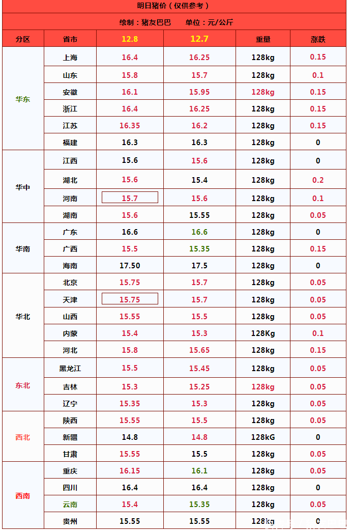 具体来看,在寰球主流南北地区,其中,朔方市集,黑吉辽地区,生猪报价在15.3~15.5元/公斤,山西以及河北报价在15.55~15.8元/公斤,西北陕甘地区报价在15.55元/公斤!在南边市集,当今,川渝两地生猪报价在16.15~16.4元,山东报价在15.8元,浙江报价在16.4元,福建报价在16.3元,河南报价在15.7元,湖南报价在15.6元,广东报价在16.6元/公斤!